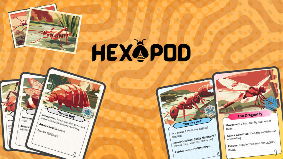 Hexapod is a 1v1 tactical board game where players battle for control using decks of insect-themed unit cards. With asymmetric unit abilities, spatial control, and a dynamic board, each match is a test of strategic movement and deck composition.
