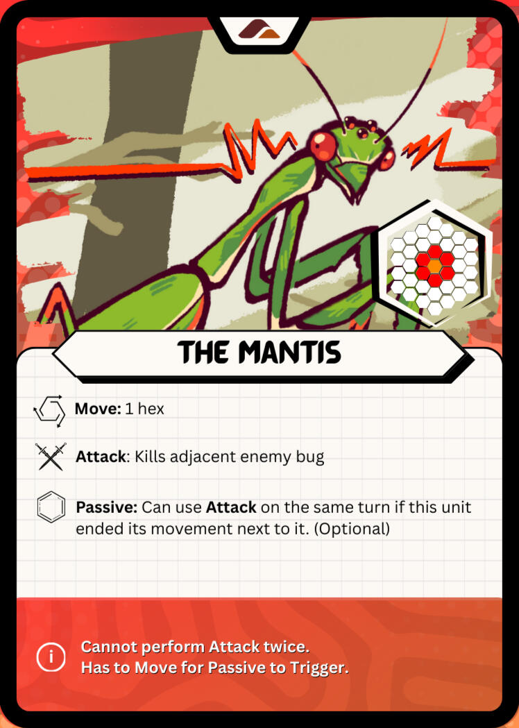 A fierce predator on the battlefield. The Mantis is a Radical unit that embodies the ruthless efficiency of its real-world counterpart. Its abilities to slash through enemy bugs during movement, allow it to dominate the board. But its rarity means you’ll only get one shot!"Very scary, be sure to set up defenses!"