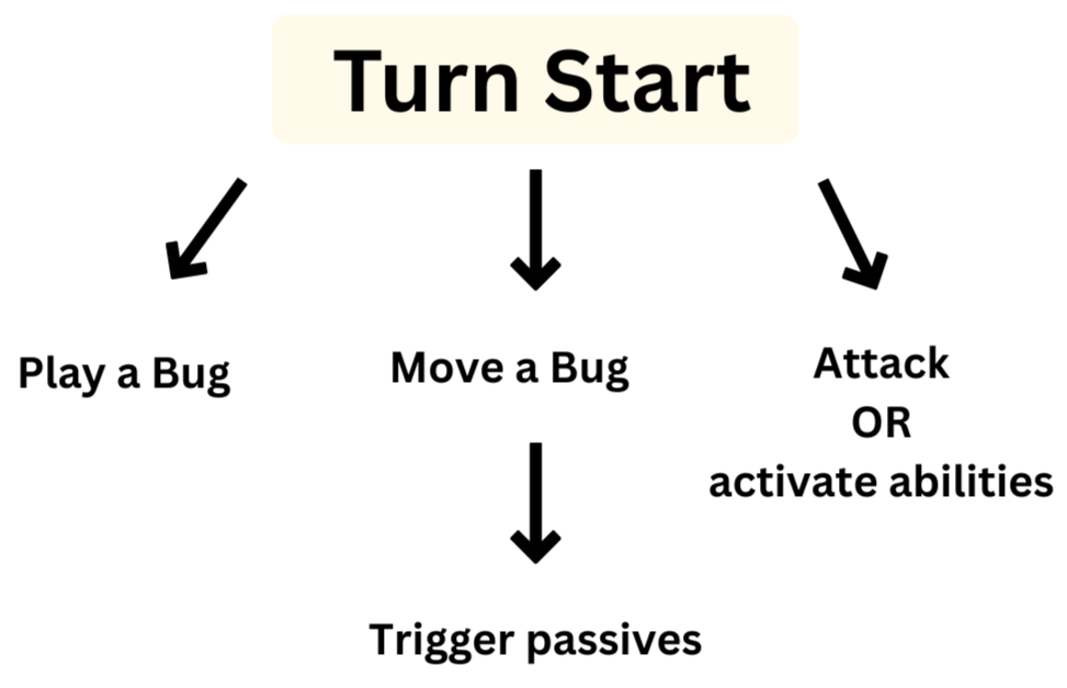 You cannot use both actions on the same unit.✦ Play a Bug Card → Spawn a new unit near your Queen or Nest✦ Move a Unit → Advance and possibly discover new terrain✦ Use a Unit’s Ability → Attack, or activate special abilities✦ Harvest Nectar