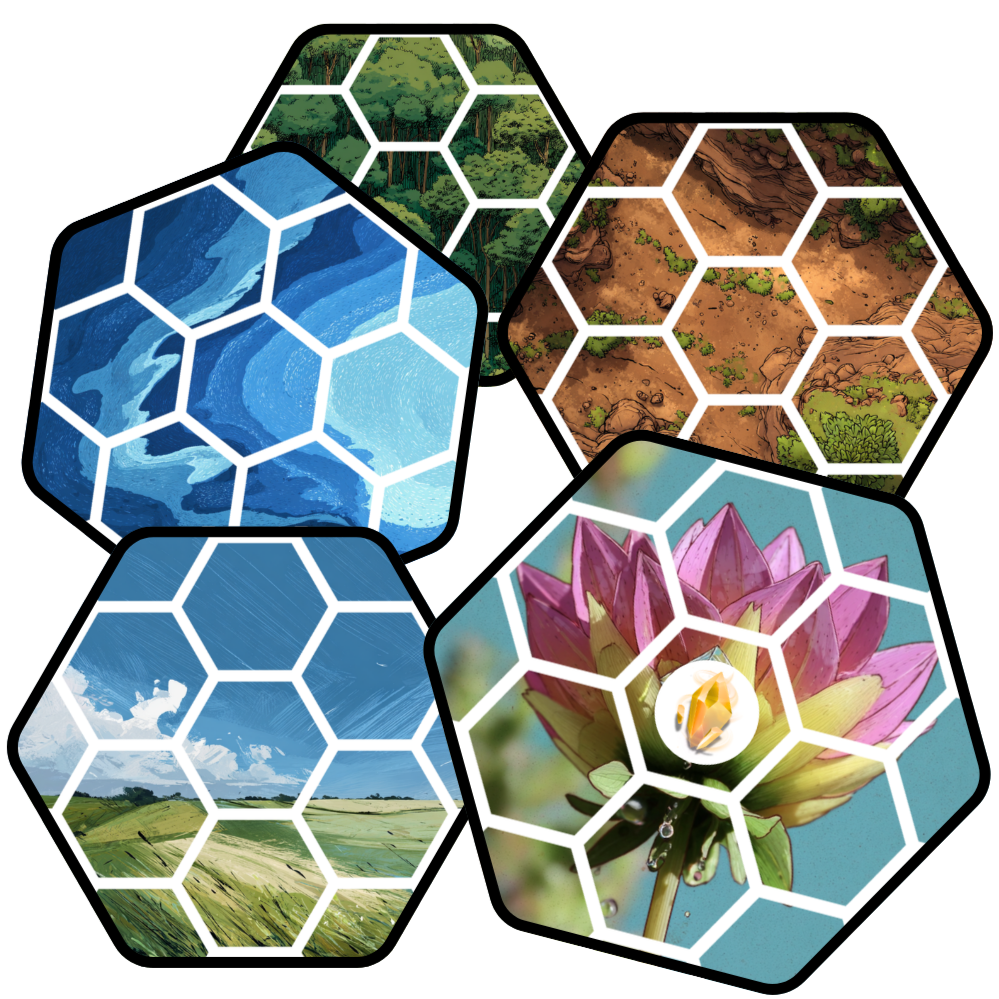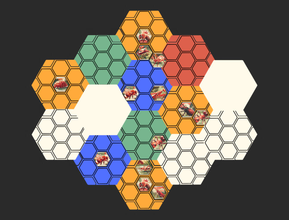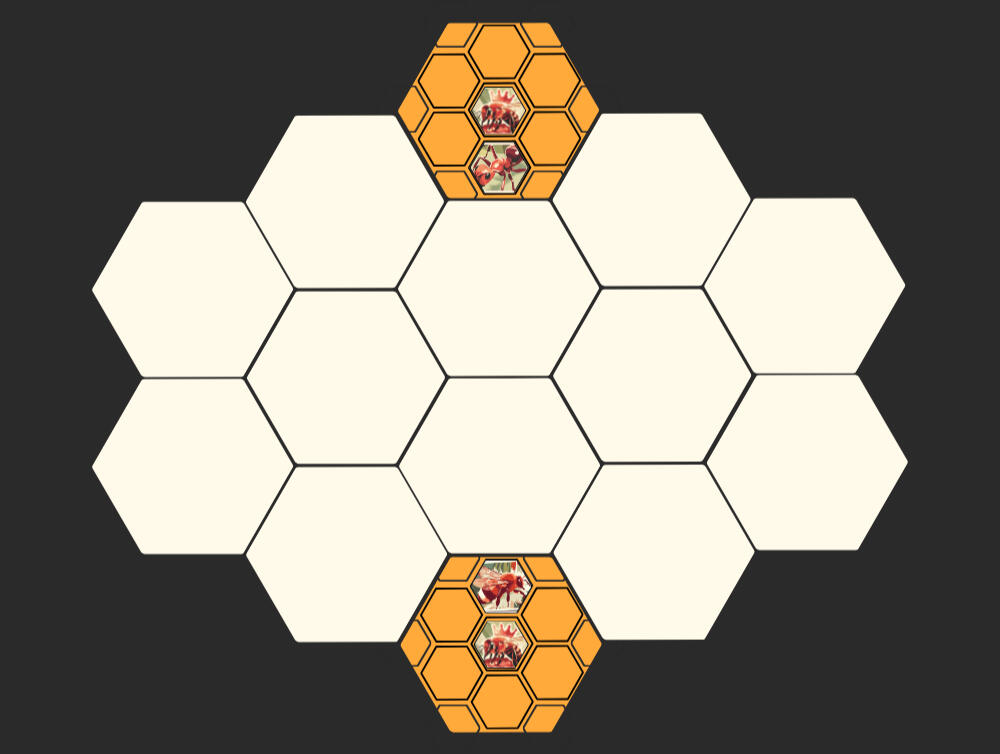 We are inspired by the shape of Gliński’s hexagonal chess board like Hive the board game. Our twist comes from discovering the board to find advantages terrain and most imporatntly Nectar